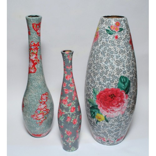A set of three beautiful vases decopatched in vintage stlye papers to make a lovely collection. They are finished with two coats of varnish and are plastic lines ready for use. The largest measures 37cm tall and the smallest 29.5cm. Special Offer - buy all three for £60.