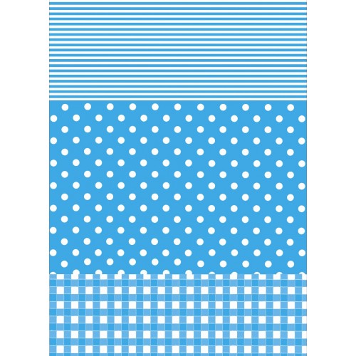 These papers, specially made, are thin but very strong so they will not tear or bobble when glue is applied, and are easily smoothed out. This paper has sections of spots, stripes and checks in turquoise and white.