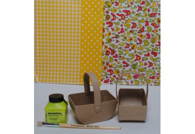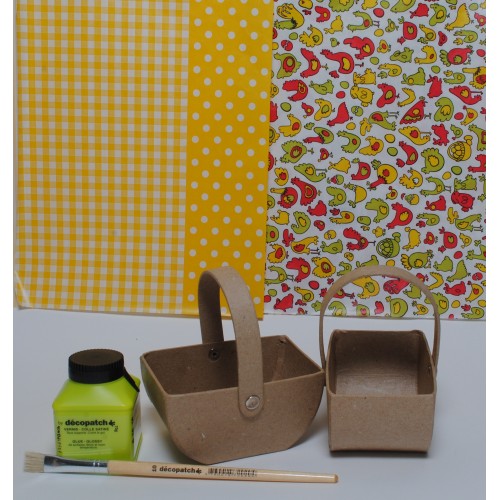 The kit comes with the papier mache baskets, the decopatch papers shown (one with a chicken design on), glue, a brush and instructions. If you would like a special selection of your own choice of decopatch papers please go to our Papers section to choose and send us a note of the paper numbers with your order. (We enclose two paper designs with this kit.)