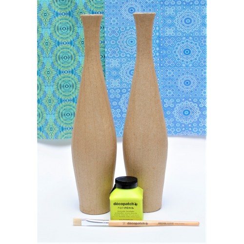 .The kit includes the two vases, a selection of papers in your colour choice, glue, a brush and instructions.